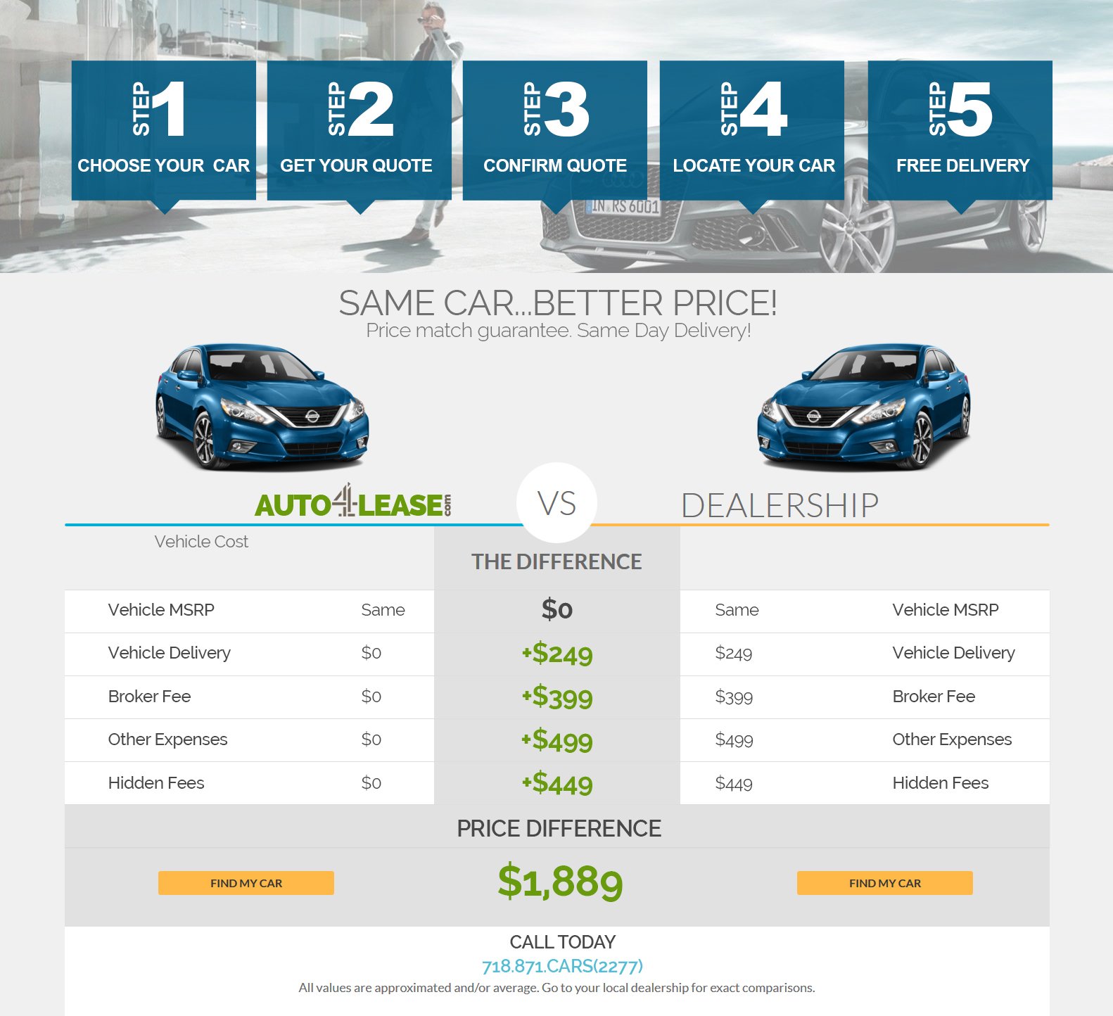 Exclusive access to marked down car leasing inventory & Limited Discounts offered by corporations & unions. No money (zero) down car lease specials. Our Price Match Guarantee ensures we match or beat any auto lease price. Auto4Lease is accredited by New York Chamber of Commerce and Better Business Bureau (BBB).